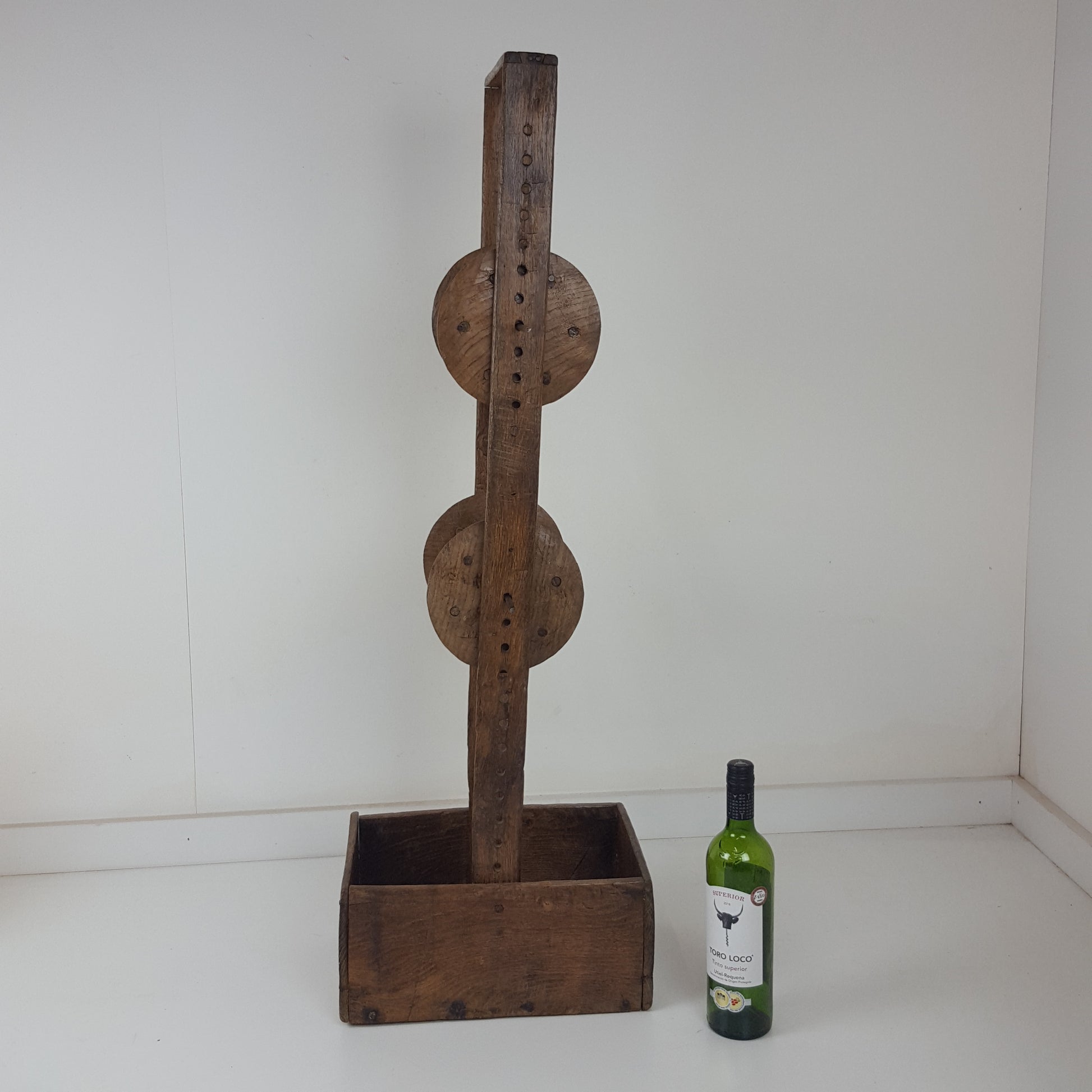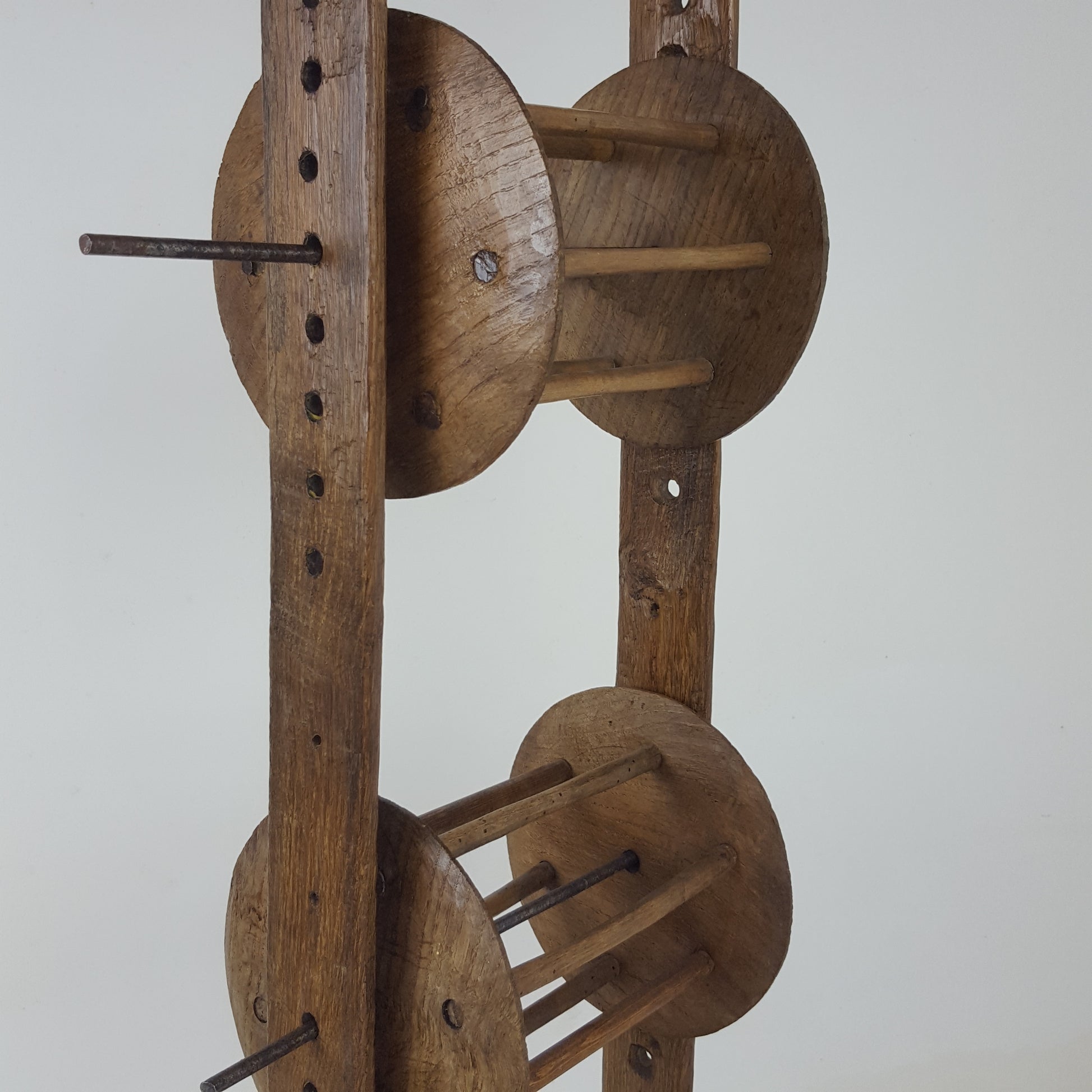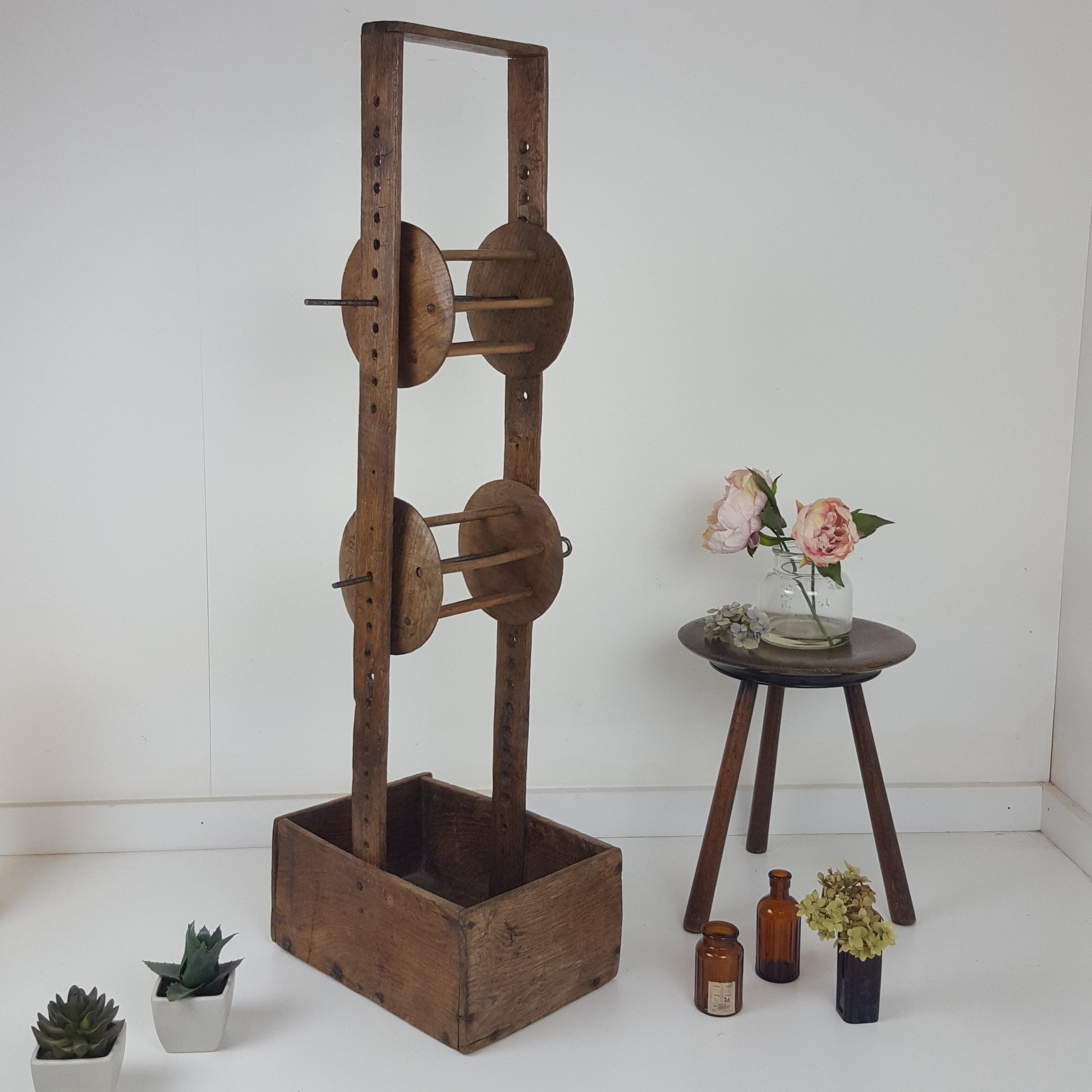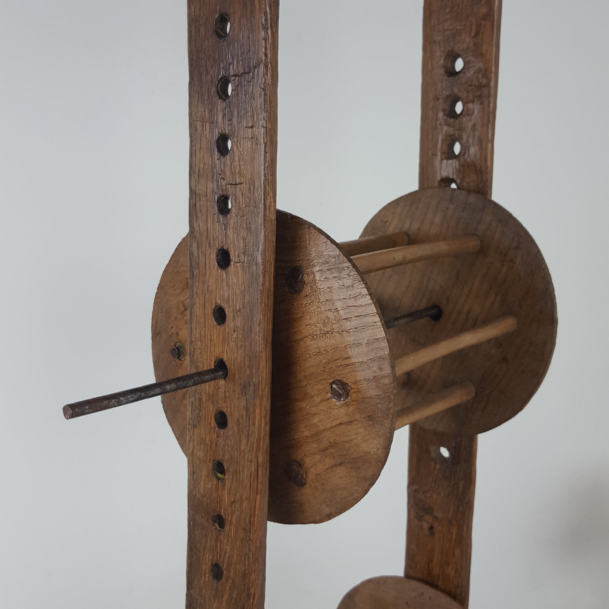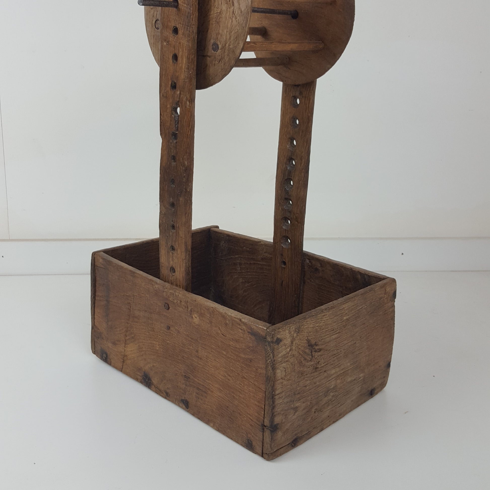 A primitive oak wool winder, with two rotating cages fitted with metal winding handles. Unfortunately we know little more than this - possibly Circa 1900s. A great decorative piece, and a perfect museum display piece - and useful too! Has signs of historic long gone woodworm.