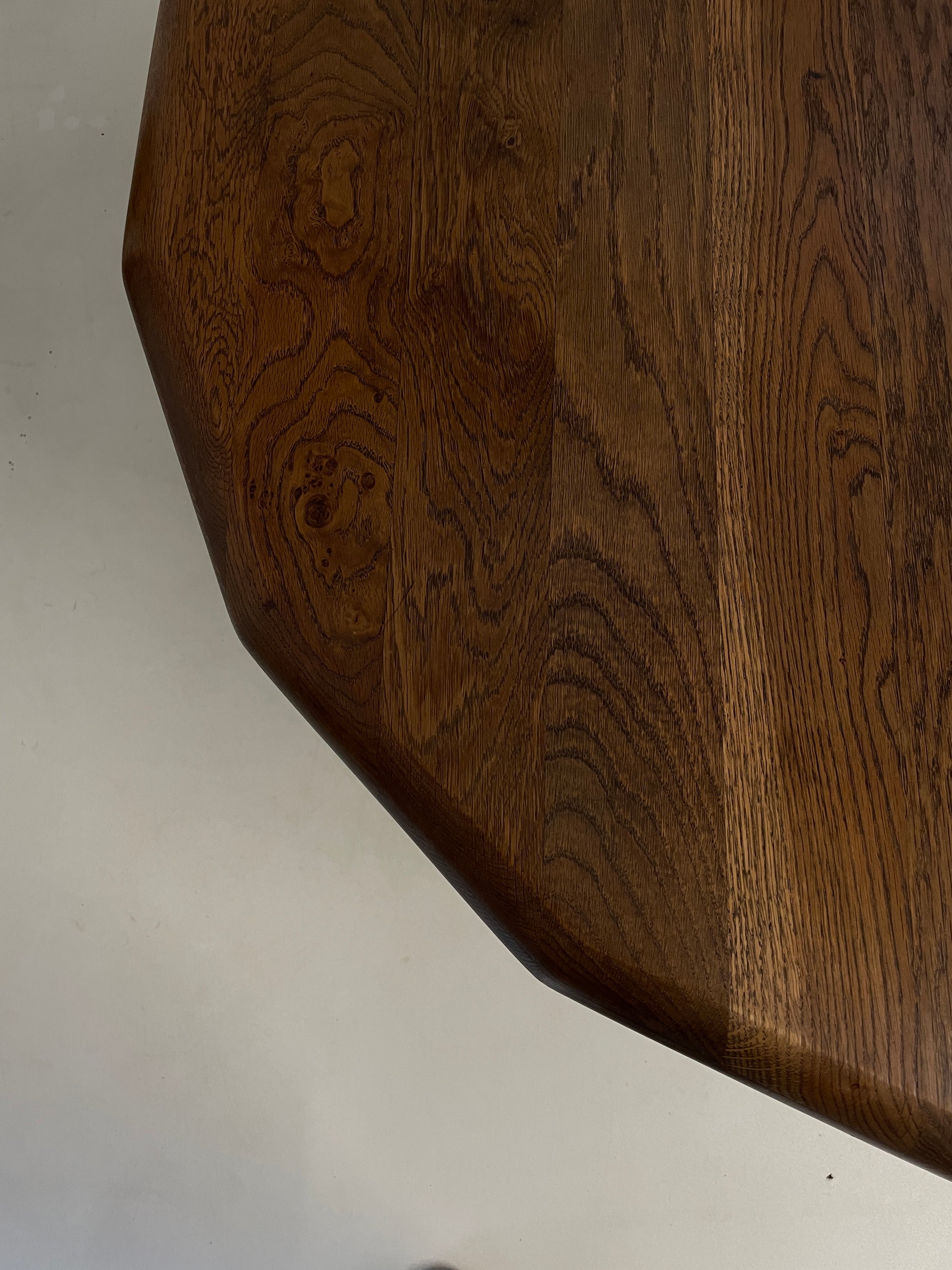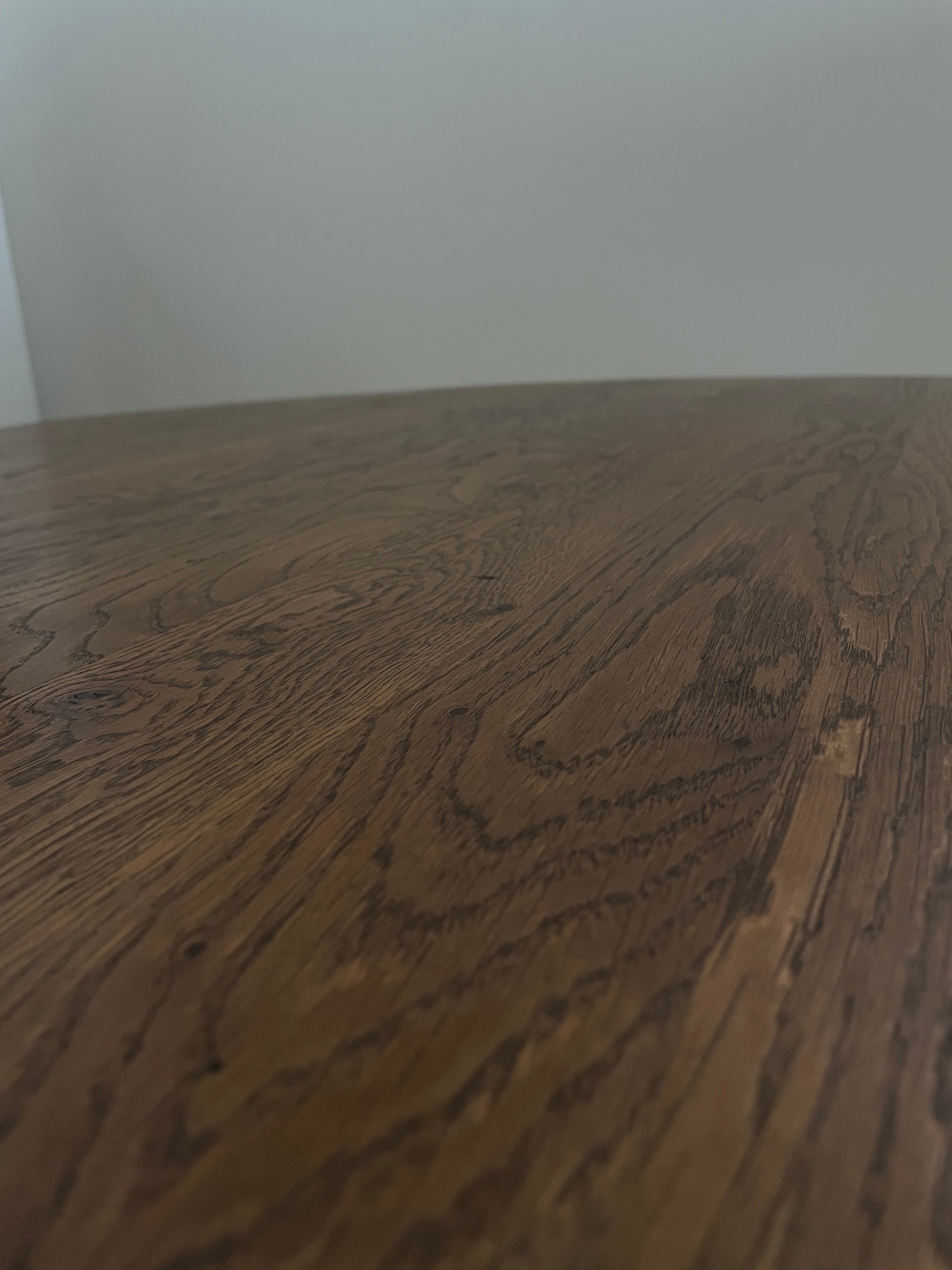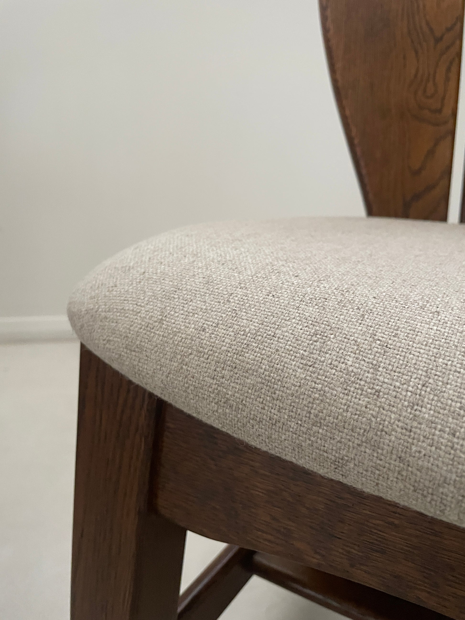 The chairs are solid, striking in design and robust. The wood is a warm dark oak, the table top has been refinished. Each chair has had new foams and been reupholstered in a complimentary neutral fabric, making them comfy and practical. We chose Camira Main Line flax which is a blend of wool and plant based fibres. Main Line Flax is a sustainable fabric made from 75% wool and 25% flax - made here in West Yorkshire.