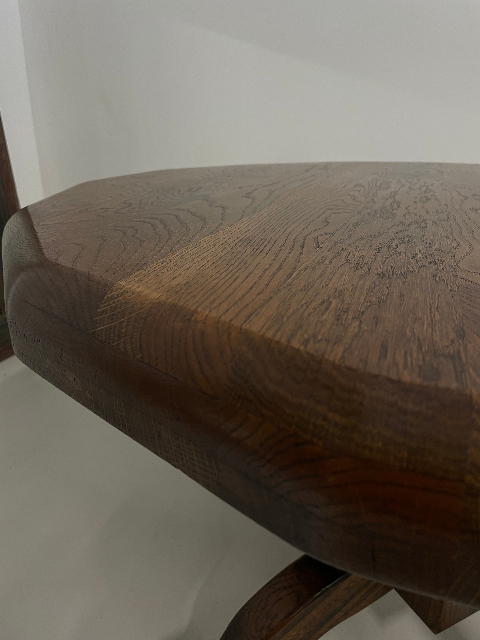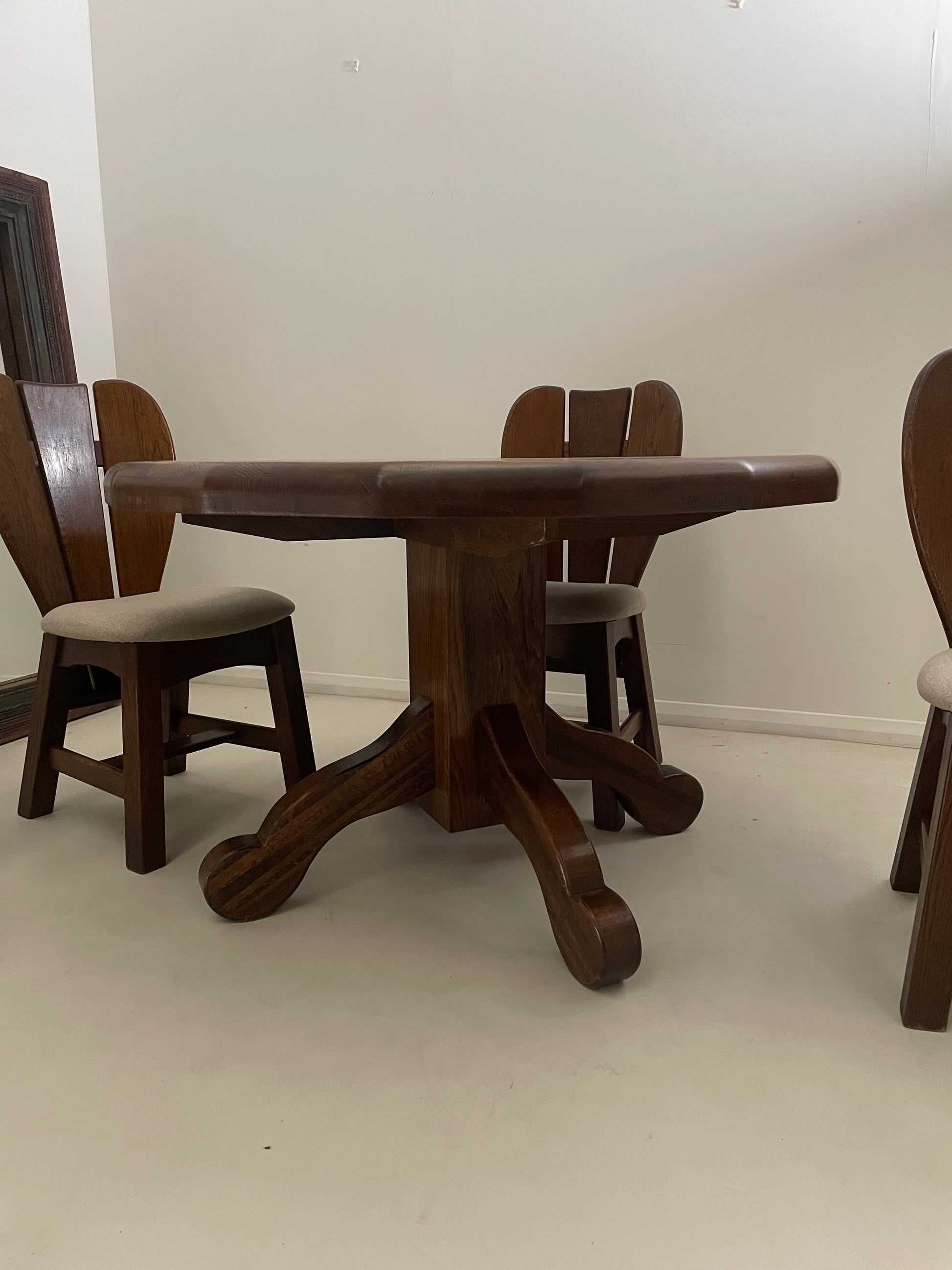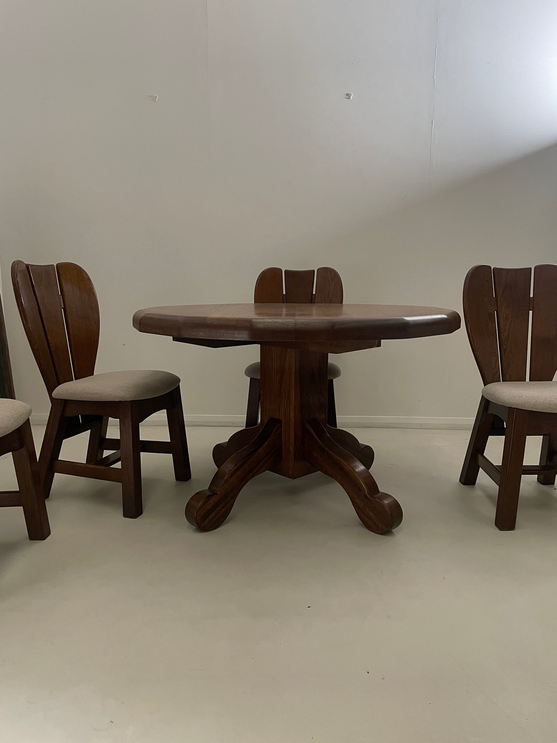 A striking solid, well constructed oak vintage brutalist dining set from the 1970s.