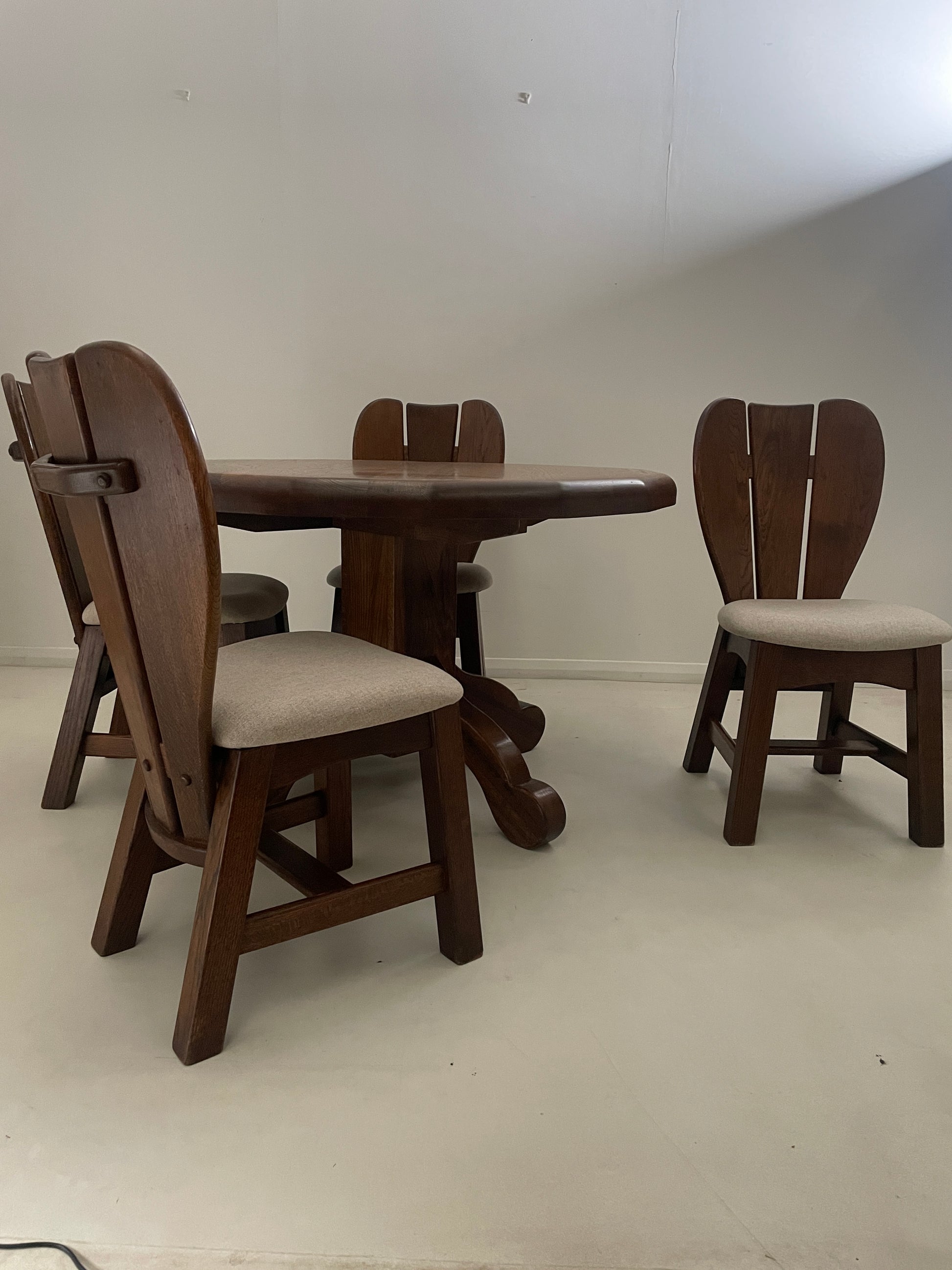BRUTALIST 1970s BELGIUM OAK DINING TABLE & 4 CHAIRS