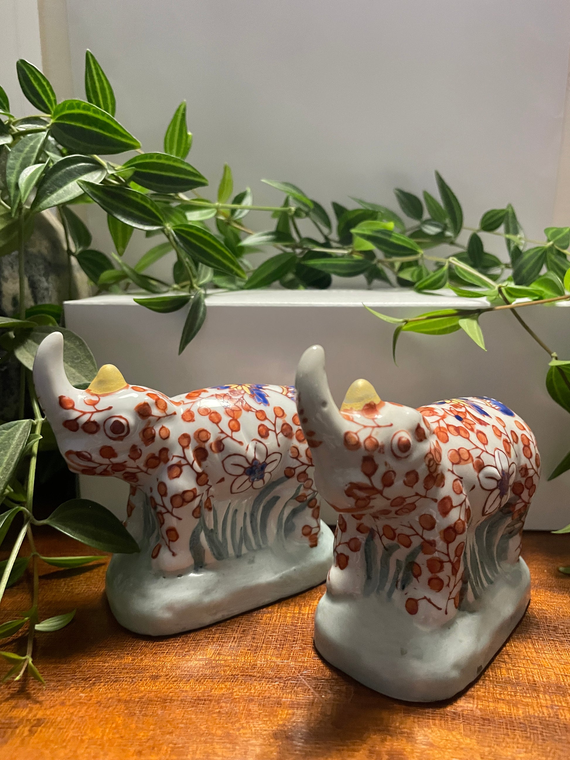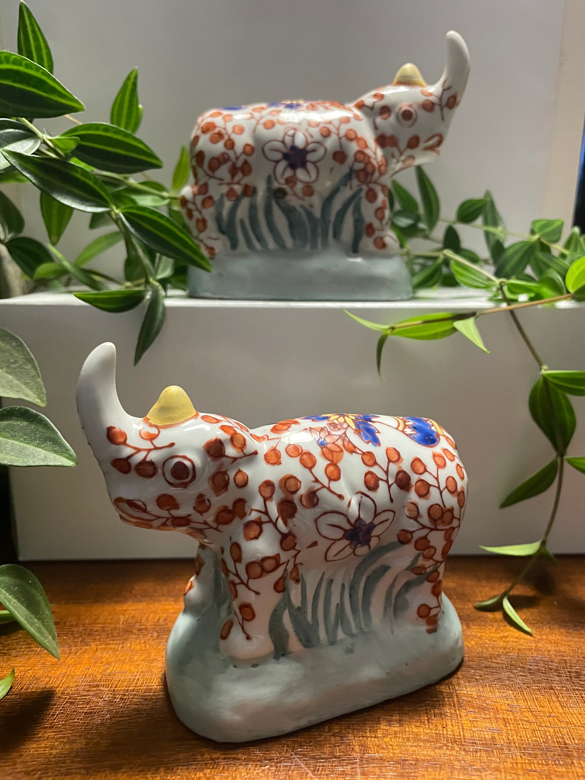 Everyone loves Rhinos and it’s lovely to find a pair! These pretty Chinese Imari porcelain rhino figurines are in great condition. Each hand painted with a similar design in wonderful colours by YaYou Zhen Cang.