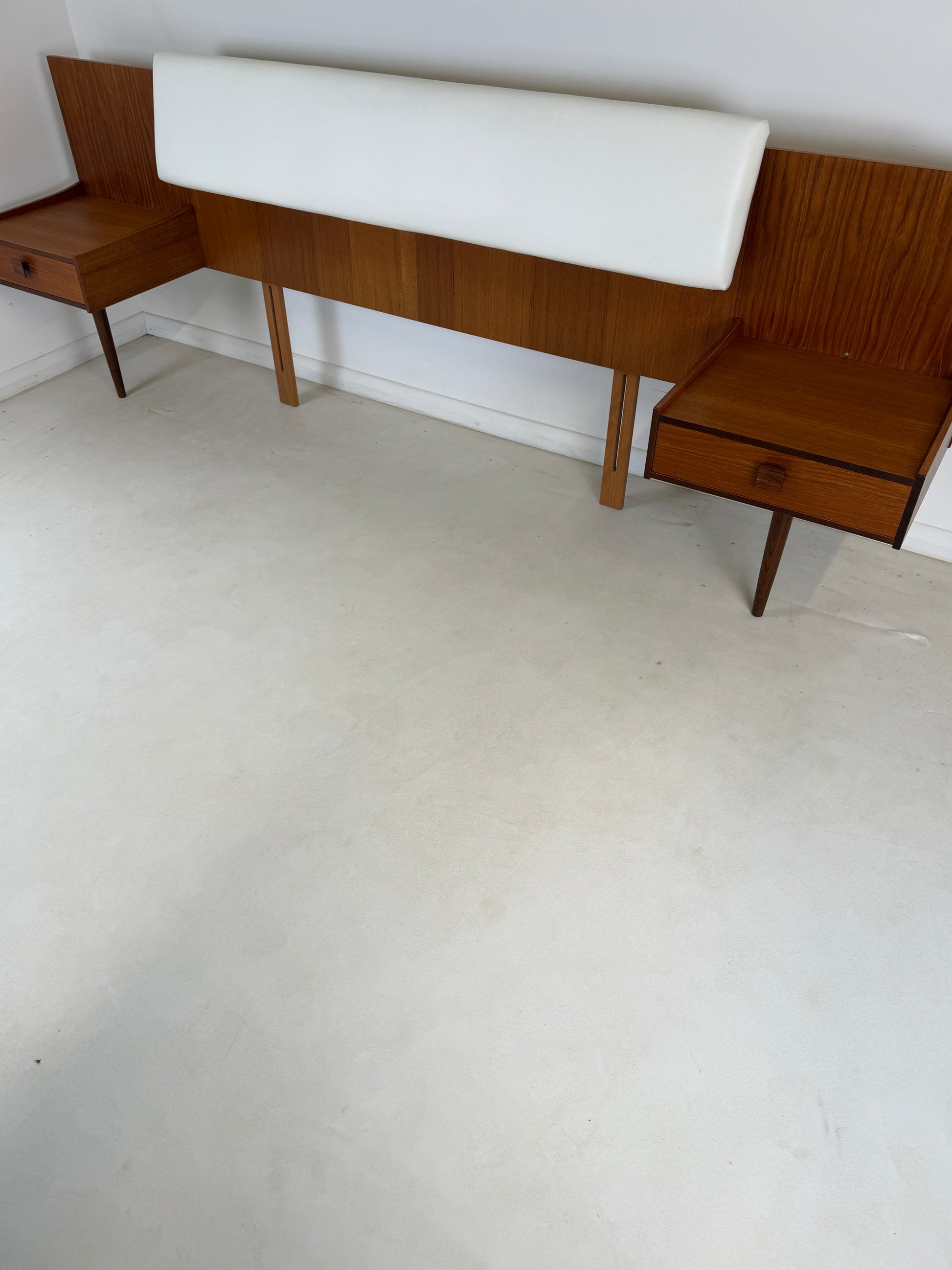 The bedsides are affixed to a teak backboard, which features a new foam headboard reupholstered in a faux white leather. We do offer upholstery services if the colour is not to your desired choice. Each bedside features a lovely square handle pull, and at some point a small hole has been drilled so a lamp wire can be threaded through.