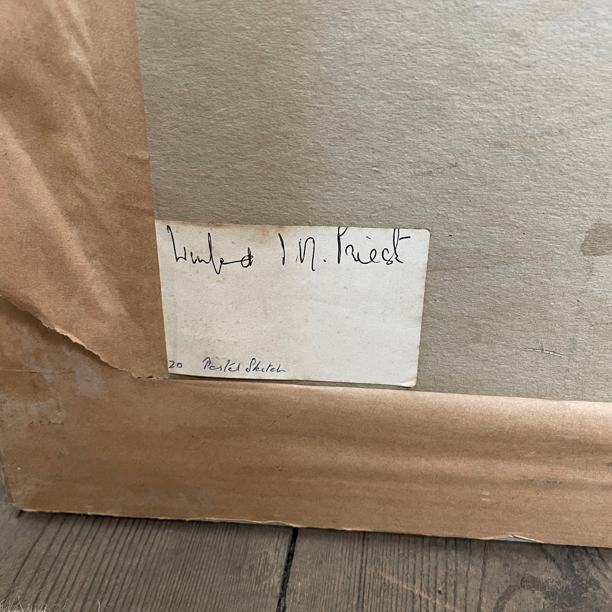 An original pastel portrait sketch depicting a lady holding a basket. It’s very pretty and in muted colours. The name Winifred I N Priest is written on the back, this could be the artist or sitter we don’t know.