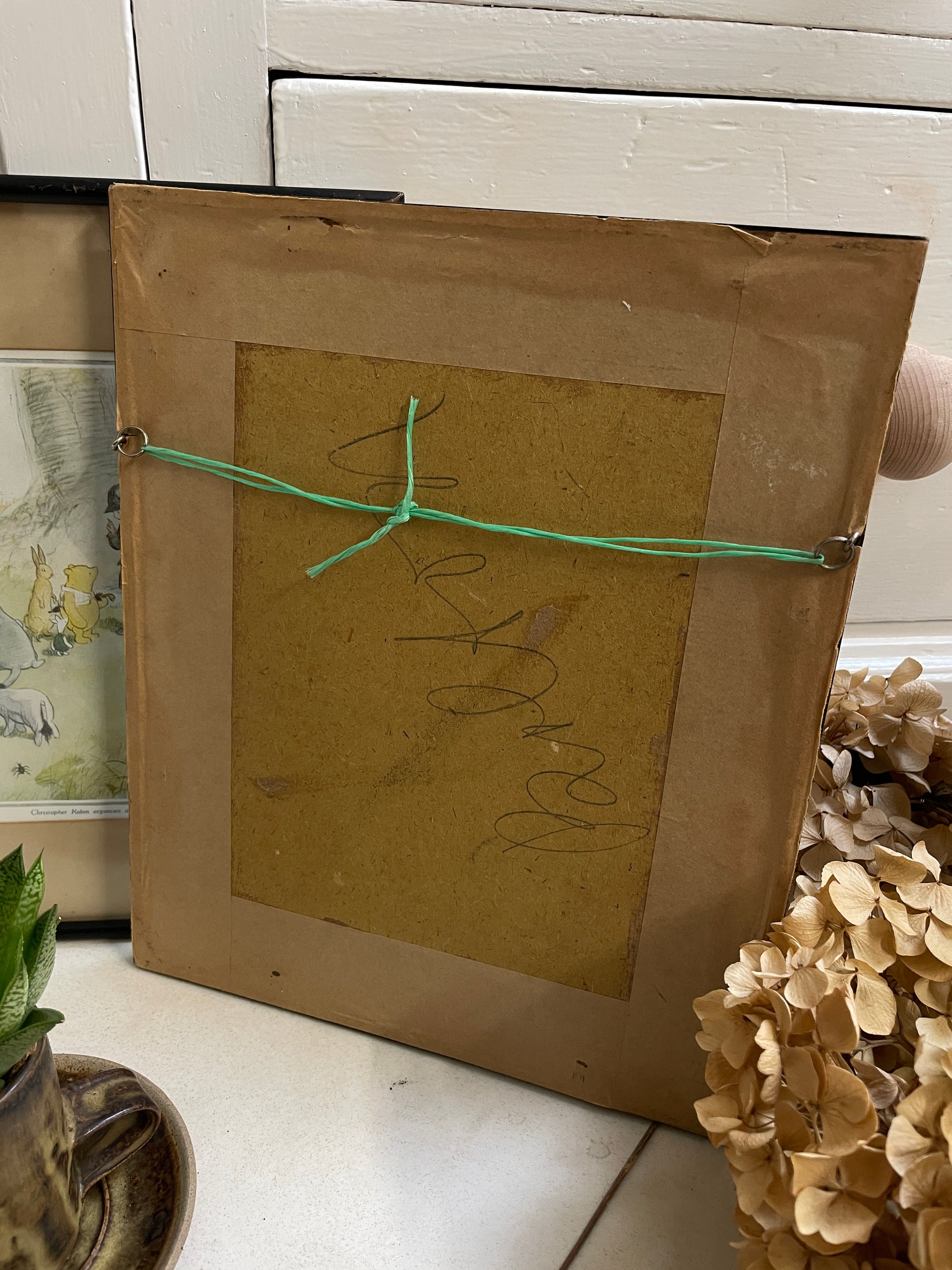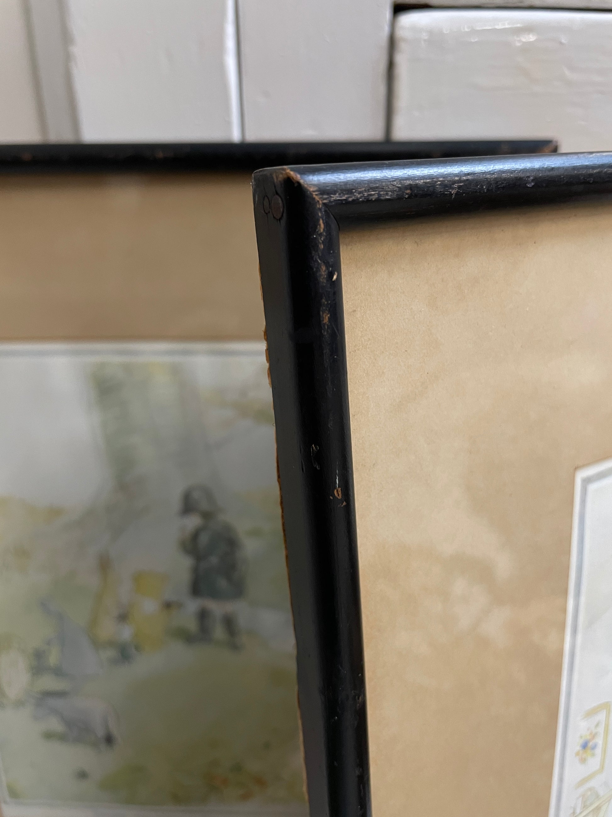 Professionally framed many decades ago, the frames have beautifully aged, with knocks and scuffs, the mounts showing some age too - all adding to the character of these two prints. It’s likely they were part of a set made for promotional marketing in a magazine. The prints are pretty muted colours in a watercolour style.