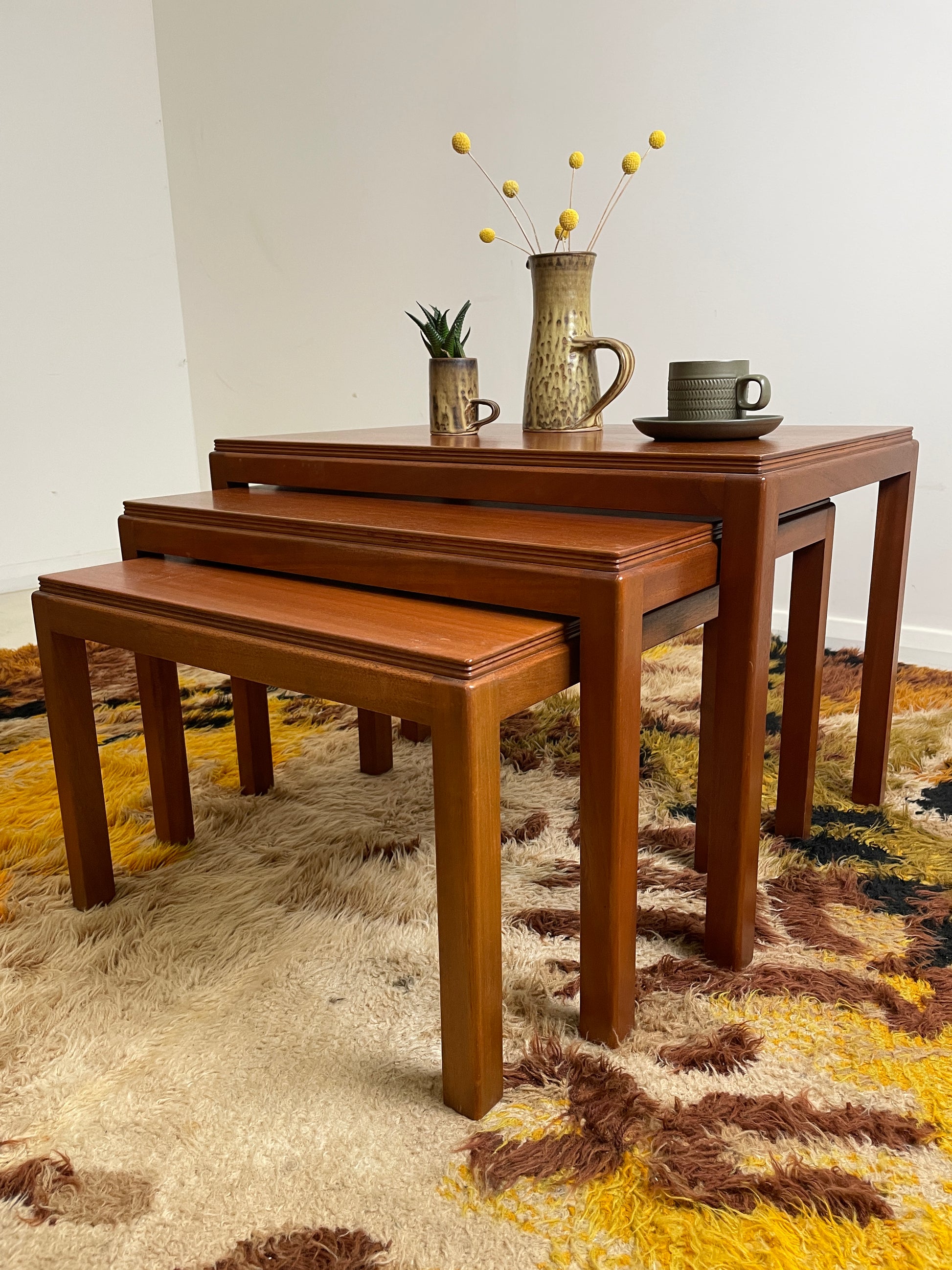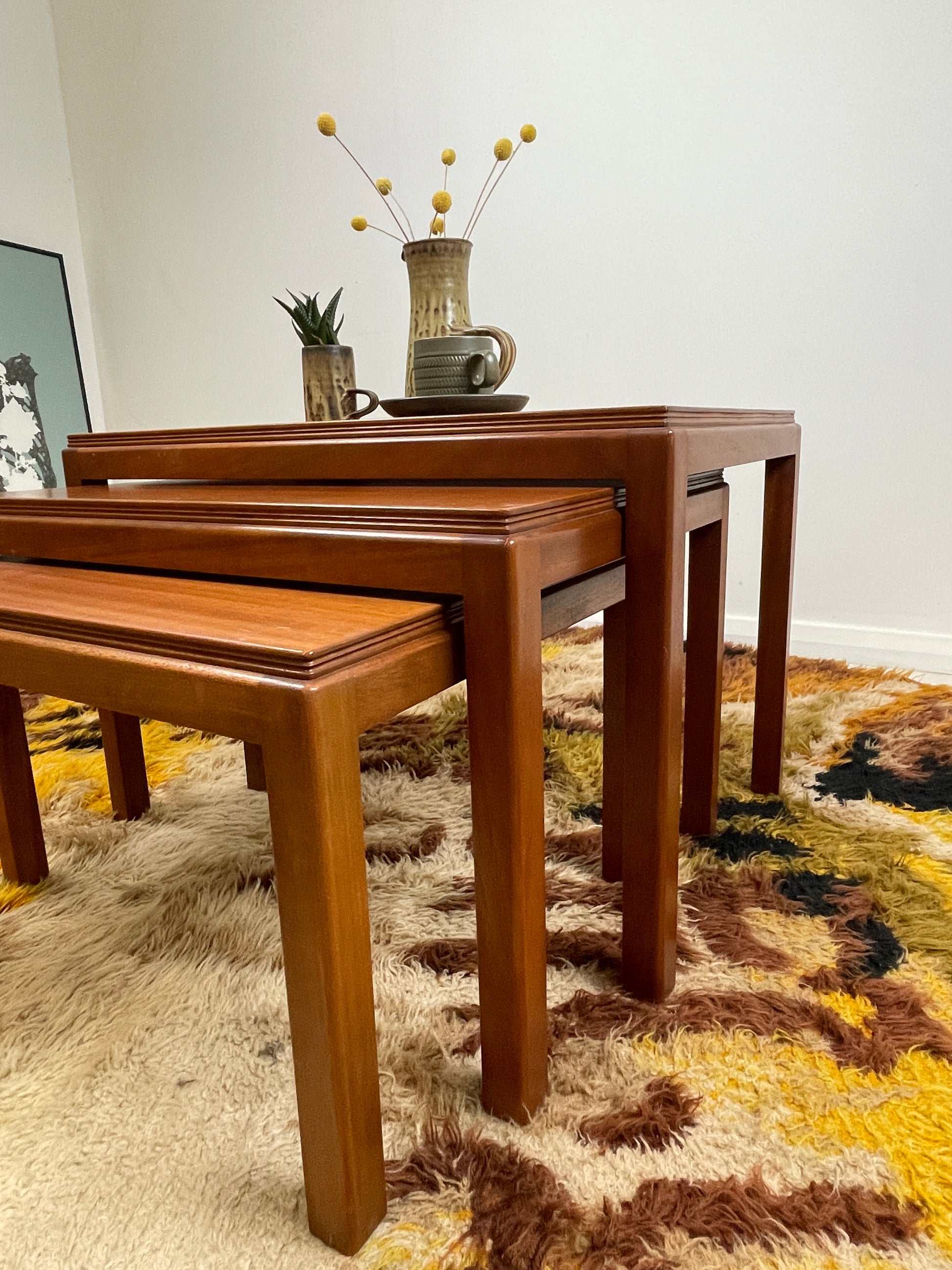 A larger and chunkier almost modern in style but very much 1960s light mahogany nest of three tables made by Gordon Russell.