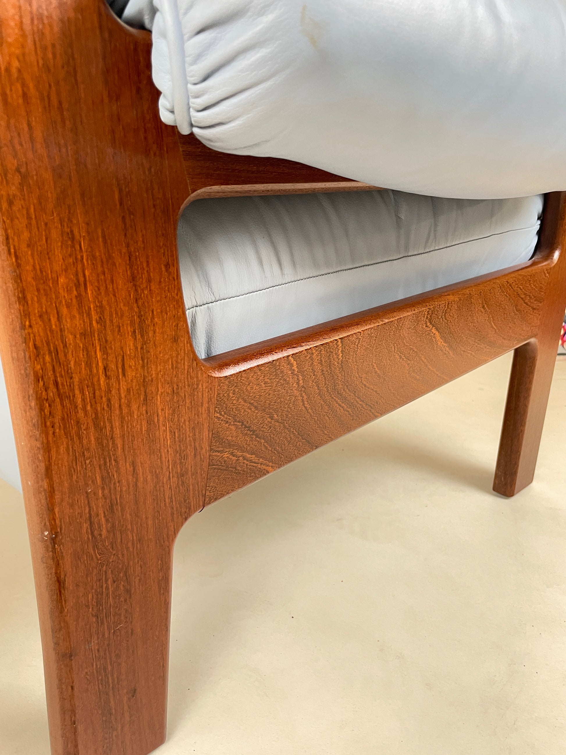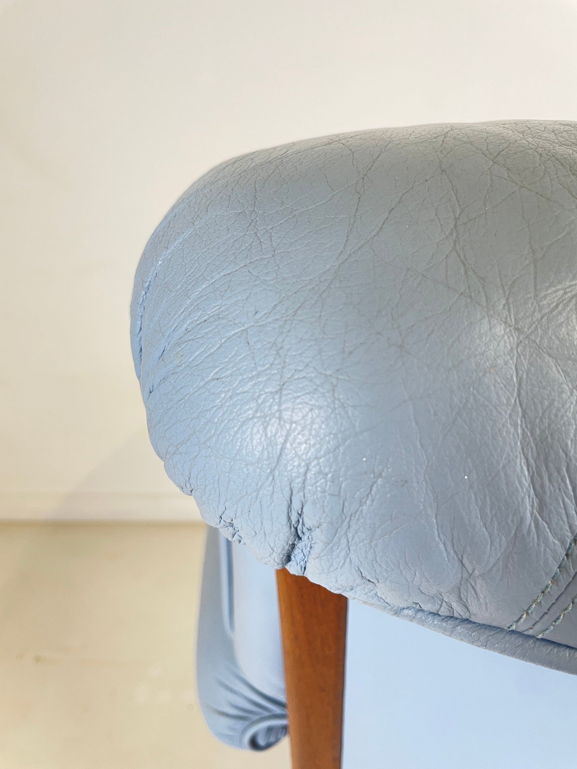 A fabulous 1990s GPLAN chair and footstool in wedgewood blue leather. Owned by one family since new the set has been well cared for, if anything the age and wear on the leather has added character. The teak frame is in superb condition. It’s super comfy and would make a great addition to any room.