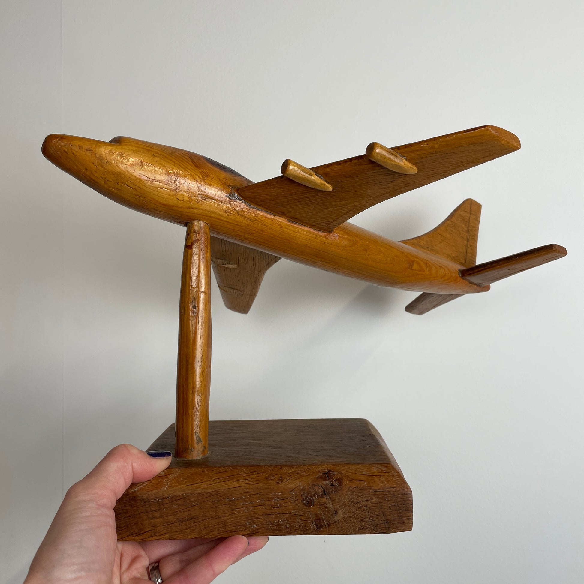 A vintage wooden scratch made plane in oak. Perfect decorative piece. The plane rests carefully on the stand. Unfortunately it’s lost two of its jets but that doesn’t distract from the look.