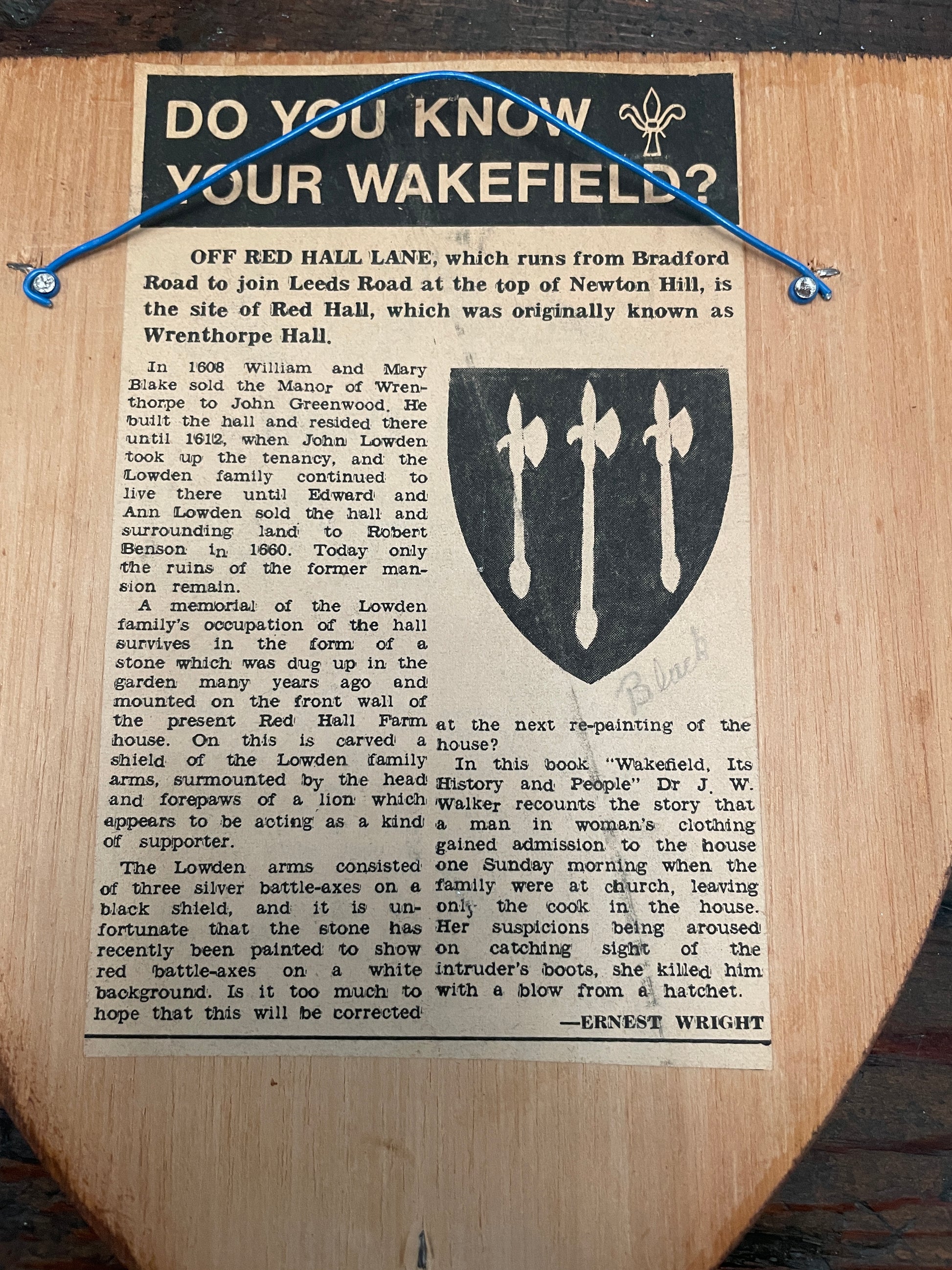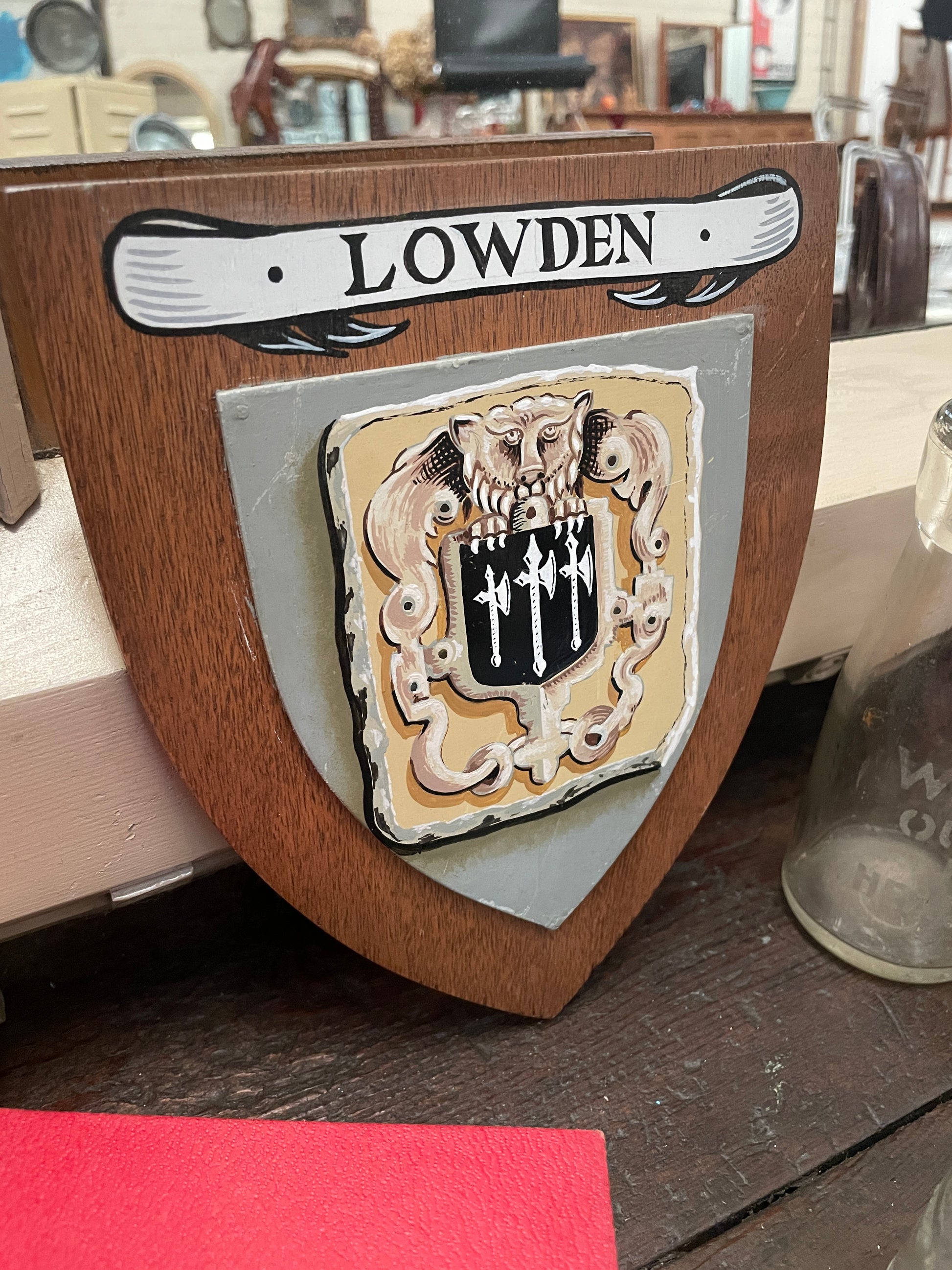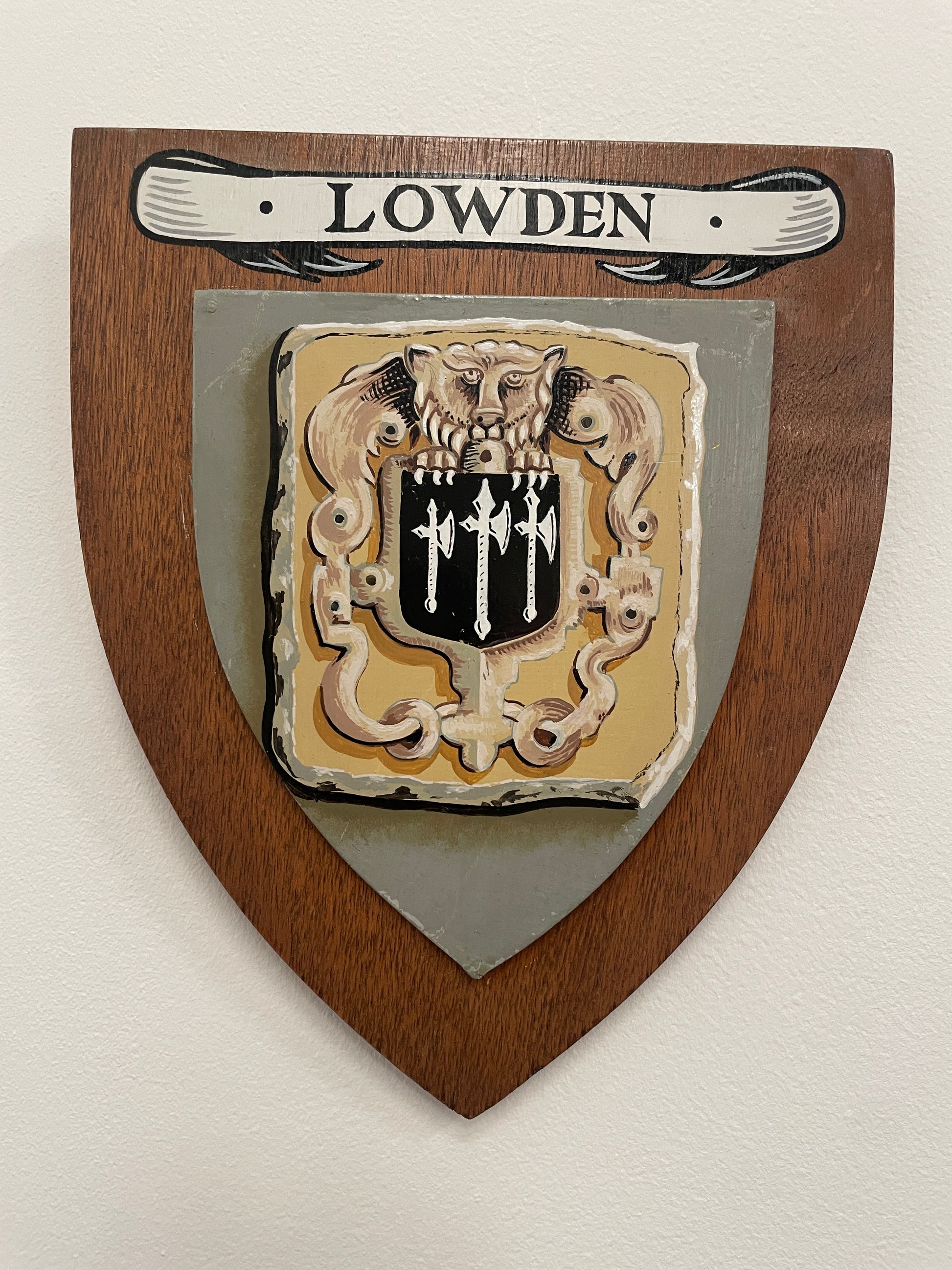 VINTAGE WOODEN SHIELD HAND PAINTED PLAQUE - LOWDEN